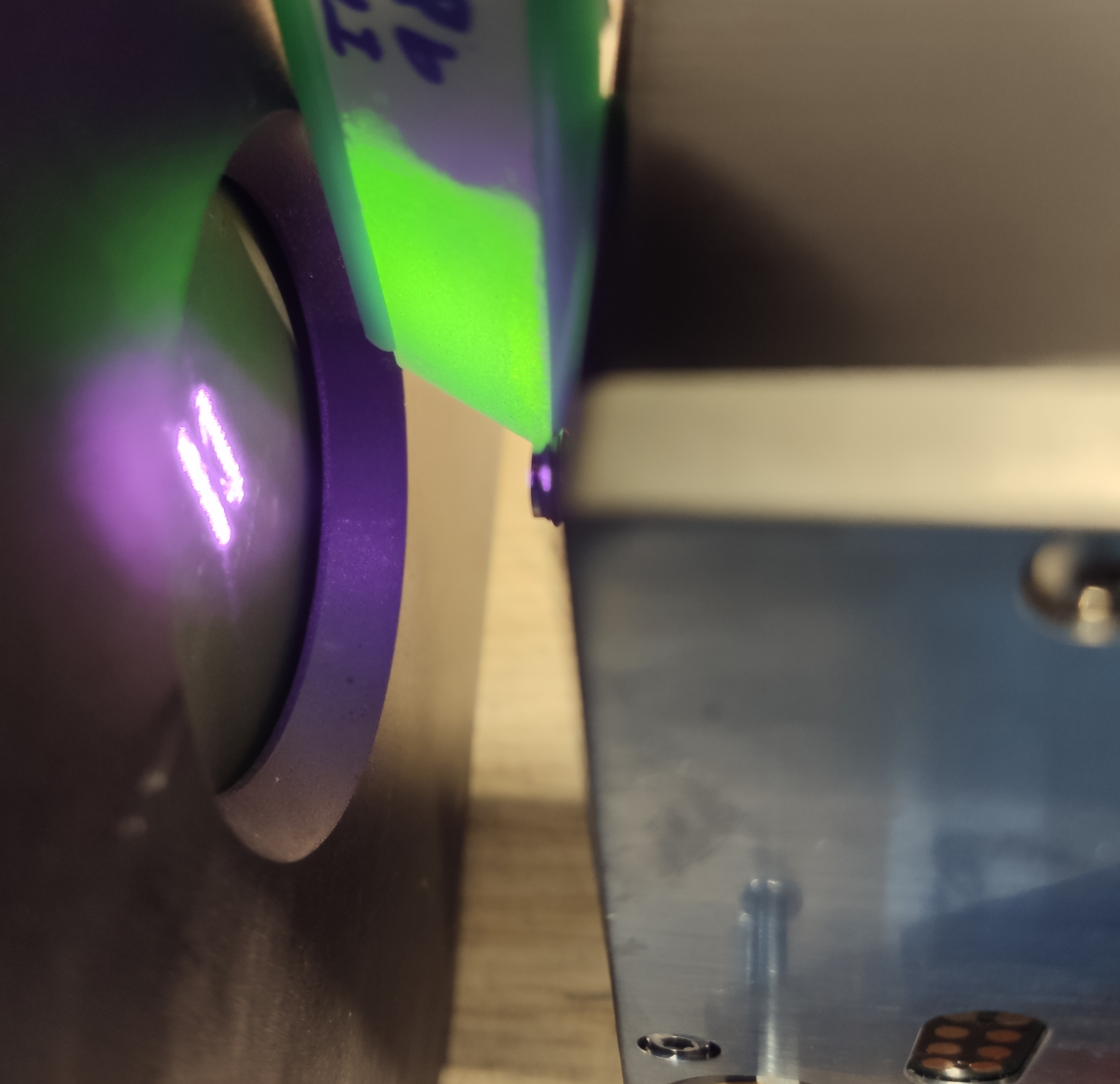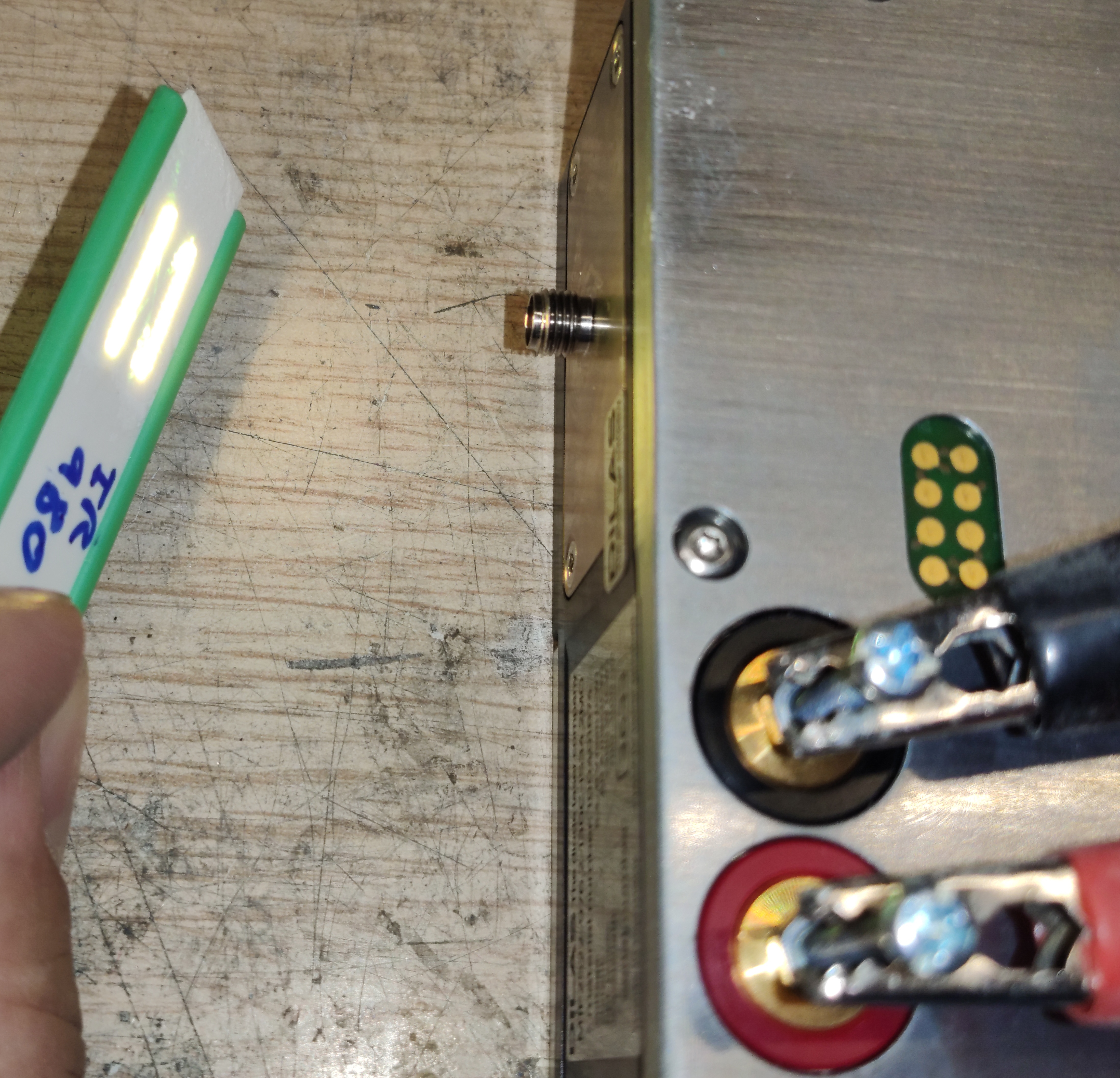 Comprobando la salida láser con un test de infrarrojos, funcionando justo por el mínimo de potencia de emisión, a 6,5V y 9Amperios.