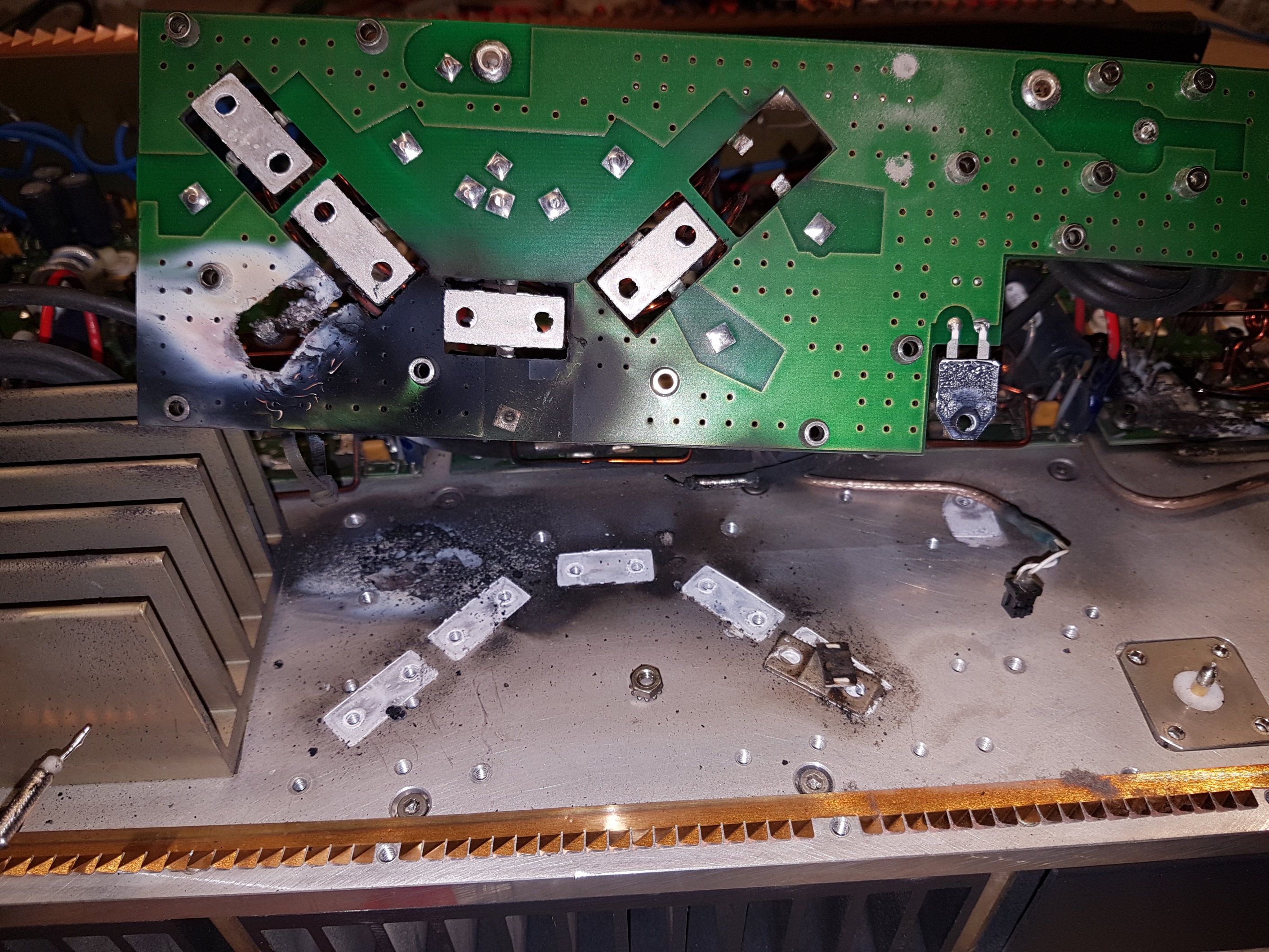 Visualmente ya se puede detectar que una etapa RF de las 5 que lleva está completamente quemada, la parte de la salida de los mosfets RF, además el splitter también está quemado en parte.
